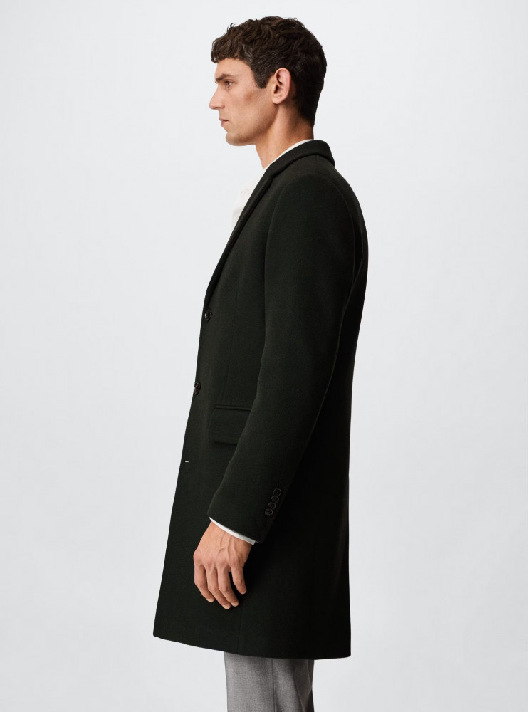 Довге чоловіче пальто з переробленої вовни Mango прямого крою, темно-зеленого кольору.